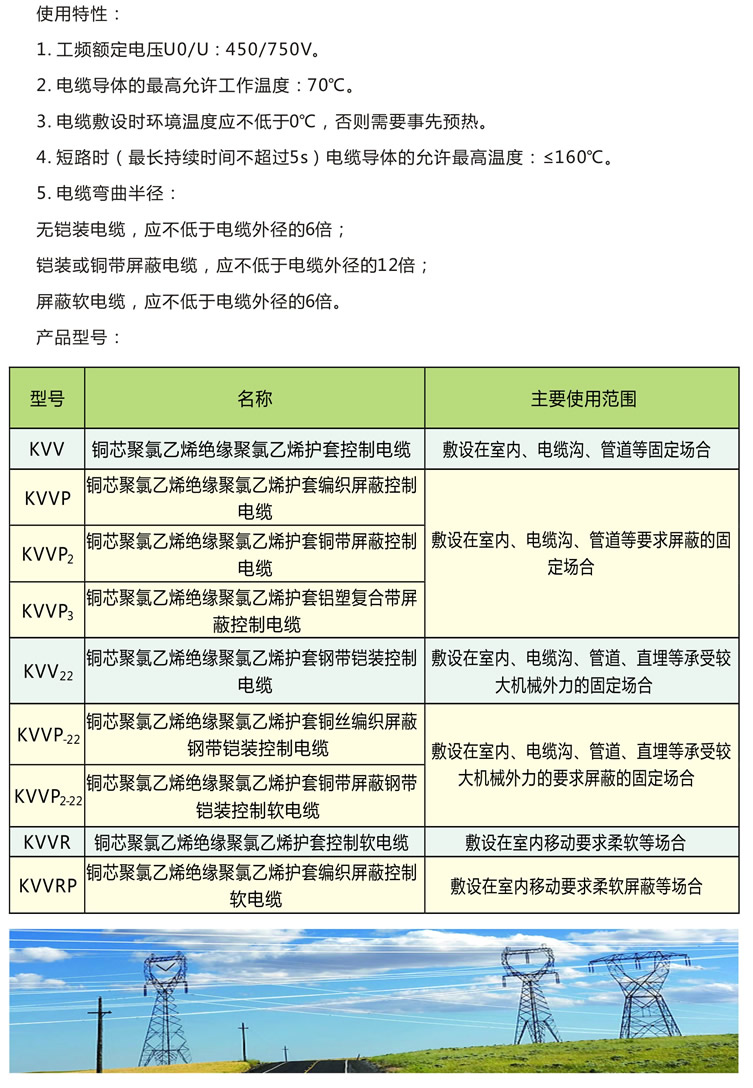 二、使用范圍 聚氯乙烯絕緣聚氯乙烯護套控制電纜適用于額定電壓450/750v及以控制、信號、保護及測量系統接線之用。