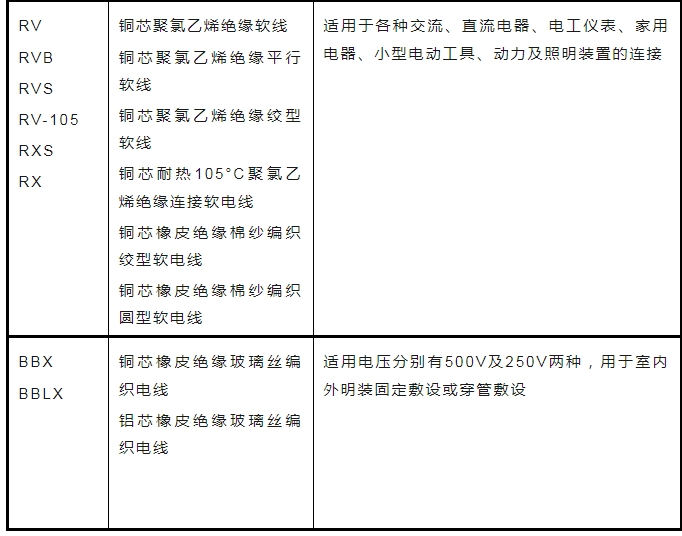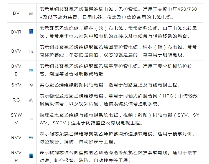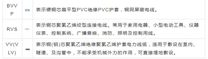 注:B(B)——第一個(gè)字母表示布線,第二個(gè)字母表示玻璃絲編制。V(V)——第一個(gè)字母表示聚乙烯(塑料)絕緣,第二個(gè)字母表示聚乙烯護(hù)套。L(L)——鋁,無(wú)L則表示銅F(F)——復(fù)合型R——軟線S——雙絞X——絕緣橡膠